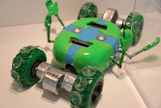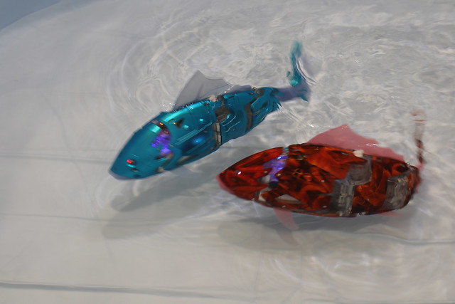 これが今回目玉の魚。意外とすばしっこくて写真がぶれちゃってます。障害センサーで自律的に泳ぎ、一回の重電で7時間泳げるのだとか。そういった省エネ技術とか防水技術とか水中障害センサーとかもなにげに凄いですよね。