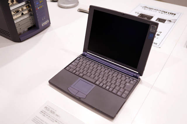 紫色のパソコン、505。紫色だった理由の1つに「経年劣化が目立ちにくい」というのがあったと記憶していますが、その狙いは当たっていますね。ちっとも劣化しているようには見えません。これをバラしてみると、当時ソニーが得意としていた小型薄型化への執念を感じることができます。