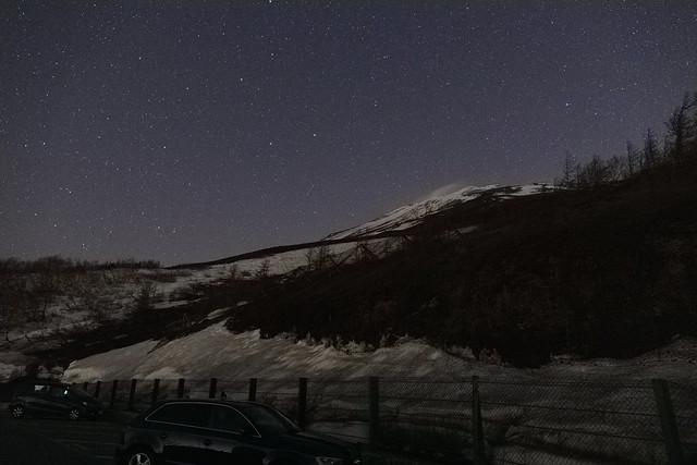 やってきました富士山5合目、富士宮口です。時間は深夜1時。肉眼ではほぼ何も見えませんが、ISO=25600は肉眼では見えないものを写します。気温は7度ですが、とにかく風が強くて体感気温が低く、ダウンジャケット1枚ではダメでその上からさらに防寒着を着ないと耐えられません。(両方持ってきて良かった…)