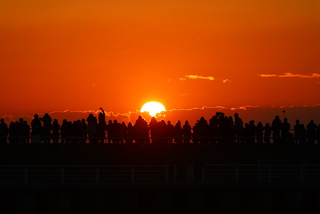 八景島には入れても、一番東の端にある桟橋は安全上の問題のせいか、日の出数分前までオープンしません。それにしても場所取りすごいっすね。まるでえびす宮の福男選びみたい。(あっ真ん中に転んでる人が…。)