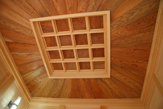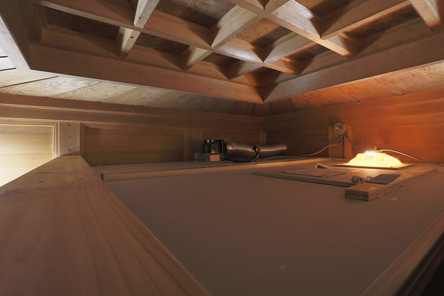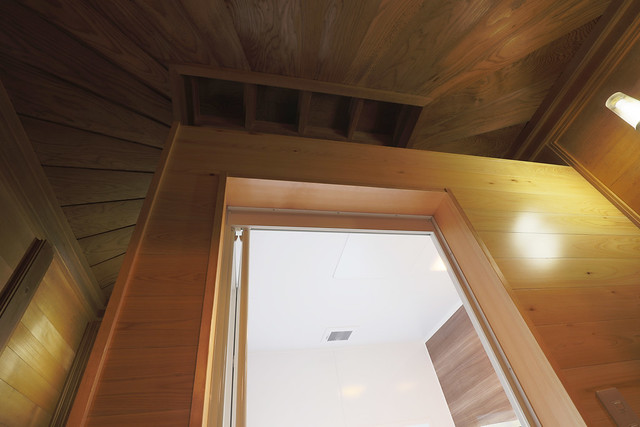 入口から上を見上げたところ。特徴的だったオリジナルの天井はそのまま別空間として残されています。新浴槽の外壁はさすがに化粧合板で、湿気に対しての耐性が大丈夫なのかな?と思いますが、まぁ価格を抑えるのに仕方ないところでしょう。