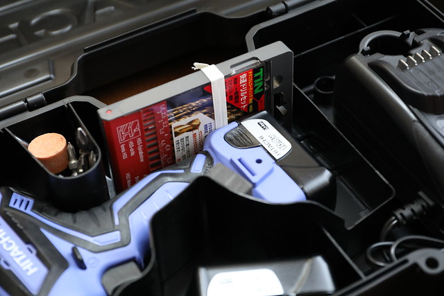 ケースが小さくなったのでいままでケースの隙間に入れていたドリル刃セットが入らないかな?と思ったんですが、今回も入りました。日立工機さん隙間を残しておいてくれてありがとう。