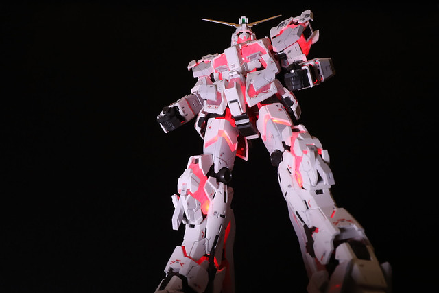 発光!まずは通常のNT-D発動時の赤色から。普通のRGユニコーンと比較すると、鼻のパーツが一回り小さい気がします。そのため、頬から顎にかけても盛大に光ります。元々RGのユニコーンはパーツポロリが少なめと聞いていますが、これは固定式なのでさらにポロリが少ないです。