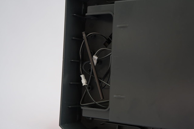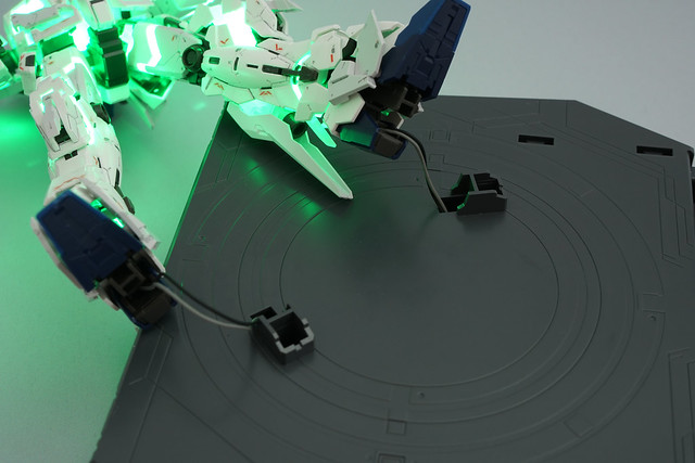 スタンド裏に収納してあるケーブルが少し長めでスタンドを置く際に噛んでしまうので、余ったランナーを利用してごく簡単なホルダー的なものを仕込みました。この斜めの簡単な棒1本で充分用が足ります。スタンドの裏に、ちょうどランナーが差し込めるような穴が設けられてるんですよね…。(穴よりランナーの方が若干太いので、先端を少し斜めにカットして差し込んで接着します。)