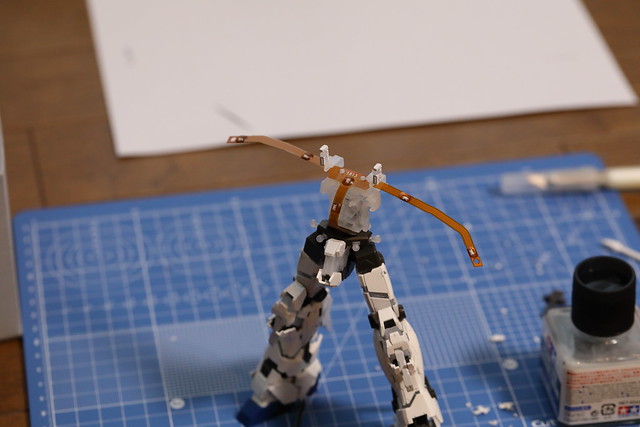 通常、ガンプラは手足、胴体、頭を別々に作り、最後に結合させますが、このモデルは分離不可能な1本のFPCケーブルを全身に貫通させる都合上、FPCケーブルを包むように足→胴体→両腕の順で組んで行きます。