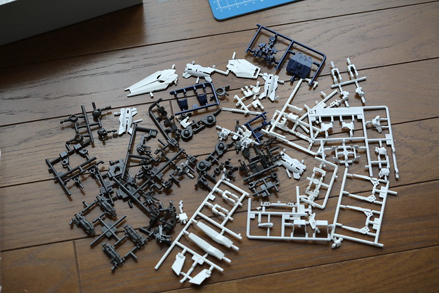 製作過程を少し。まず組立説明書で指示されているのは、未使用部品を撤去すること。同一形状の近い色の部品を間違えて付けないようにとの配慮です。にしても、可動式RGをベースにしているとは言え、これだけの余剰パーツが出るとは…。もう1体ユニコーンが作れるのではないかと思いましたが、さすがに無理でした。バンダイって以前、石油高騰のためとか言ってガンプラ値上げしなかったっけ…?
