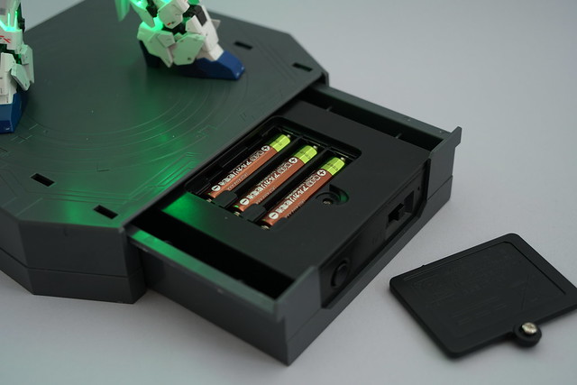 電源ユニット。単4電池を3本使います。なお発光パターンは(1)赤明滅を20秒→緑 (2)赤明滅 (3)緑明滅 の3パターン。10分でオートパワーオフが働くので、安心して点灯しておけます。