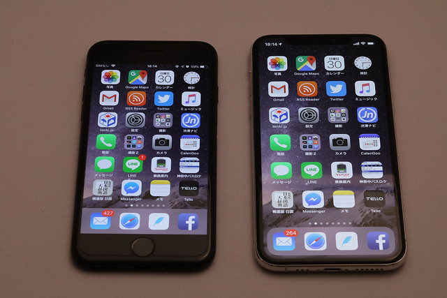 左はドナドナ予定のiPhone 7。XS(右)はこれだけ画面が大きいんだから、アイコンの縦の個数が増えるのかと思ったら増えず、間隔が広がるだけでした。勿体ない。