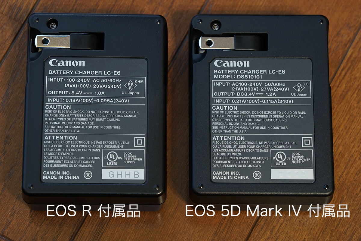 EOS R:LC-E6充電器の仕様変更 EOS 2018.12.152024.08.04 EOS Rの充電器LC-E6が、5D Mark IVのものと仕様が異なっていることに気がつきました。 どうも調べてみると、6D Mark II(2017年)付属品から仕様変更されていたようです。省エネ化しているようですが同時に出力もダウン、でも公称の充電時間は変わらないようです。