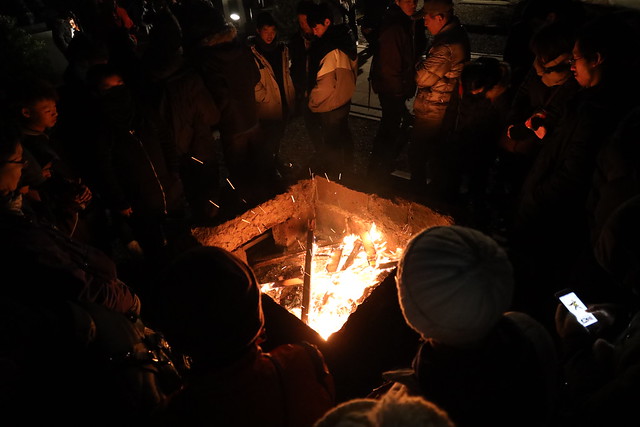 たき火で暖を取ったり、振る舞われているつきたてのきなこ餅を食べたり、初詣したりして日の出を待ちます。