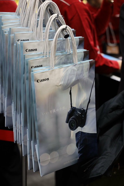 キレイめのEOS RPのショッパーがもらい放題。この辺はキヤノンの企業スケールを感じる部分。中身はEOS R/RPのカタログとRPのクリアファイルです。これ持ってる人が会場で一番目立っていました。(あとハクバもエコバッグを大量配布していたようですが、灰色という地味な色合いのため目立たず。)