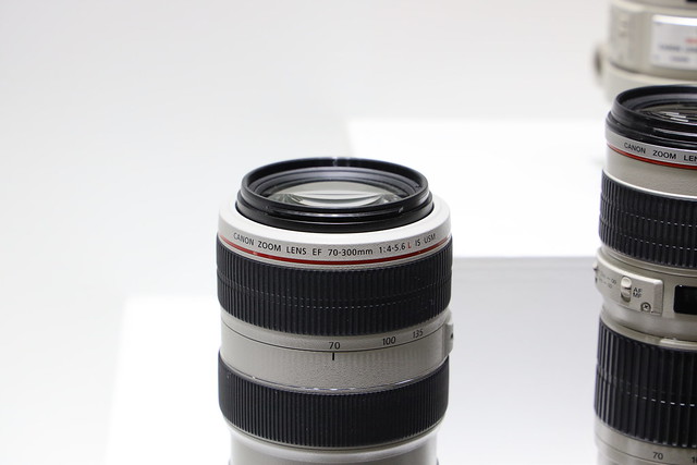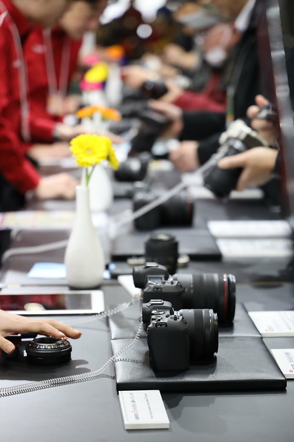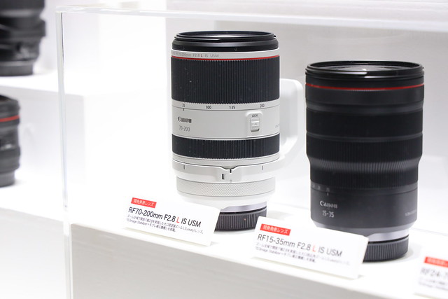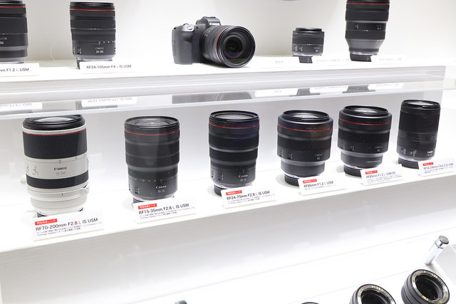 開発中のRFレンズの展示。85mmのF1.2がノーマルとDS(デフォーカス・スムージング)版の2種類あるのが驚き。24-70mmのF2.8にもついに待望のIS(手ブレ補正)が付いてこのサイズ。そして一番の驚きは70-200 F2.8L(左端の白レンズ)の小ささでしょうね。