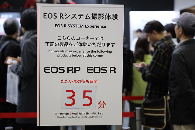 続いてキヤノンブース。EOS RPは30~40分待ちと言うことで並ぶ気せず。店頭に並ぶのを待ちます。