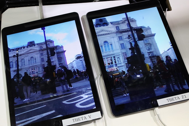 THETA Z1。ファン待望の「高画質版THETA」です。1インチセンサを2つ搭載。ただ、お値段も12万円(;´Д`)とシャレで買う値段でもなくなってしまいました。機能も複雑化したせいか、ついに耐えきれずに?表示画面を搭載。サイドボタンの数も増えています。