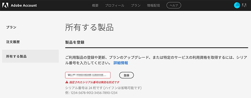 ここで、Amazonでプライムデーの際に月額プランより安く購入した「Adobe Creative Cloud フォトプラン(Photoshop+Lightroom) with 1TB|12か月版|オンラインコード版 」を登録してみます。Amazonで発行されたプロダクトキーをAmazonの指示を無視してAdobeの製品登録サイトで入力してみます。