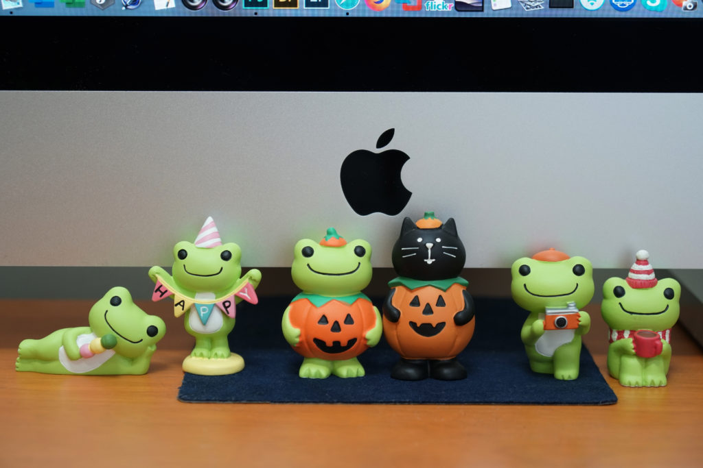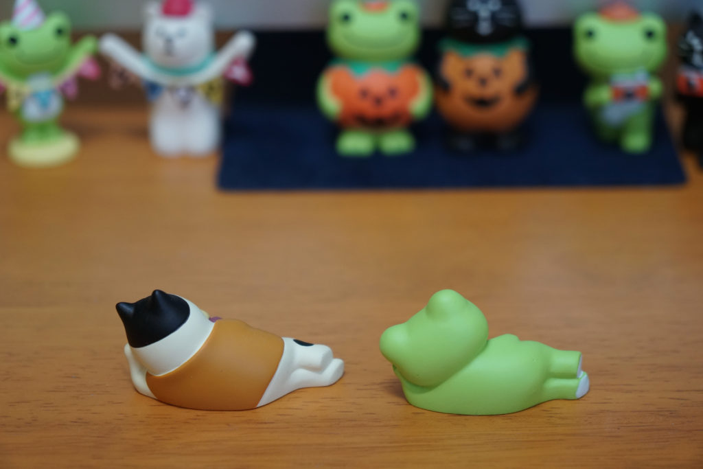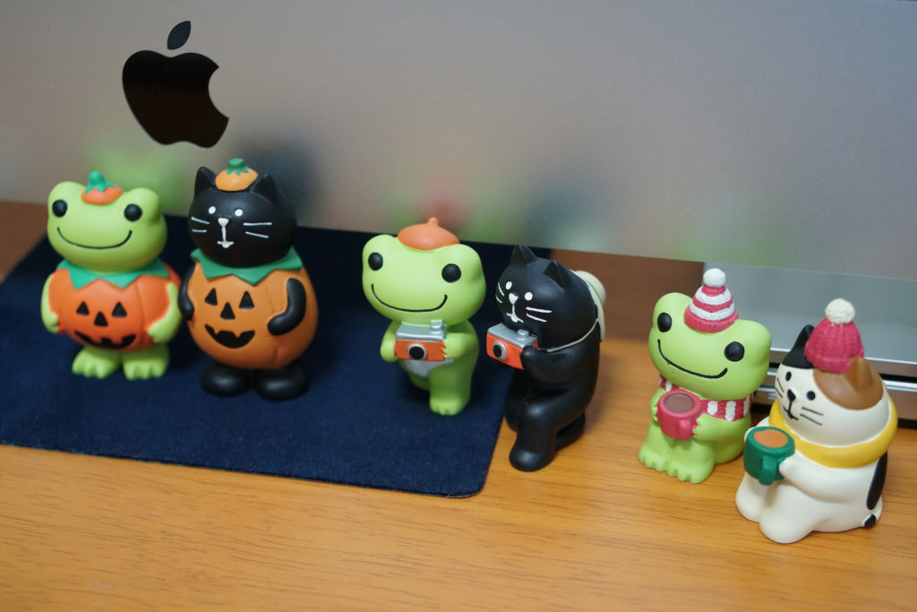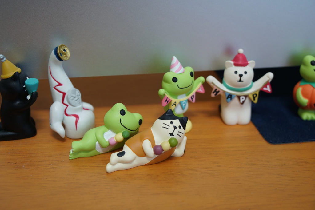 それがこの黒いネコ(メガホンだったかハロウィンだったかは失念)なのですが、その後もクリスマスとかの機会に少しずつ増えていってこんな感じに。あ、脱力した太陽の塔はmikaさんから頂いたものです。