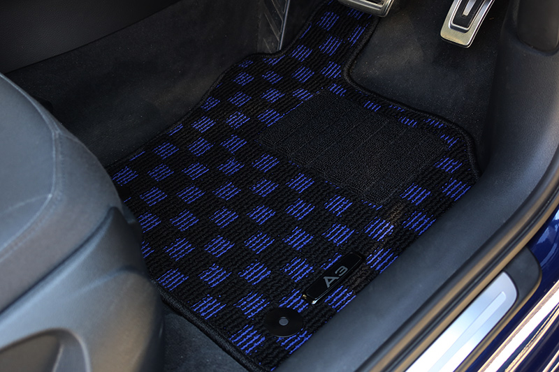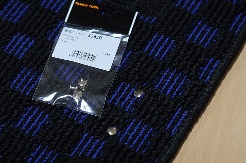 破けた純正マットからA3バッジを移植しました。組ネジに対して接着剤で取り付けています。接着にはちょっと手間取って、瞬間接着剤ではくっつかず、「ボンドウルトラ多用途SU」でもダメで、最終的にはネジの頭に少しヤスリがけして「セメダインスーパーXクリア」でくっつきました。