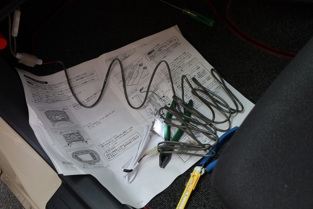 以前リアスピーカーを取り付けた際に後席ドアまでハーネスが来ていたことと、パッソも最上位モデルにはラゲージランプが装備されていることから、今回も「ラゲージにランプ用の専用ハーネスは来ているのだろう」という予測の元注文したのですが、届いたパーツを見てびっくり。やたら長いケーブル。これはどこか遠いところから延々と配線を引っ張ってこないといけないやつです。付属の施工説明書を見ても「ナビとスピードメーターを外せ」などとあり、この時点でかなり心が折れましたが、これをディーラーに頼むと工賃だけで1万円以上(標準作業時間1.2時間)なので、意を決してやります。