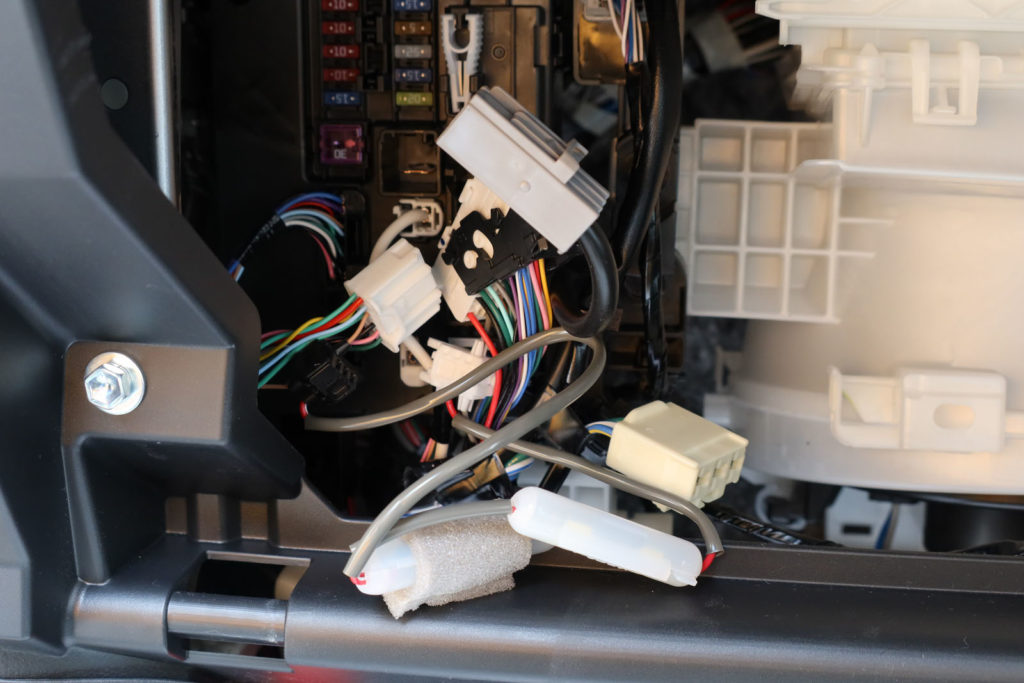 それをナビの裏、スピードメーターの裏を経由して運転席側のサイドシルに回すという超面倒くさい仕様。