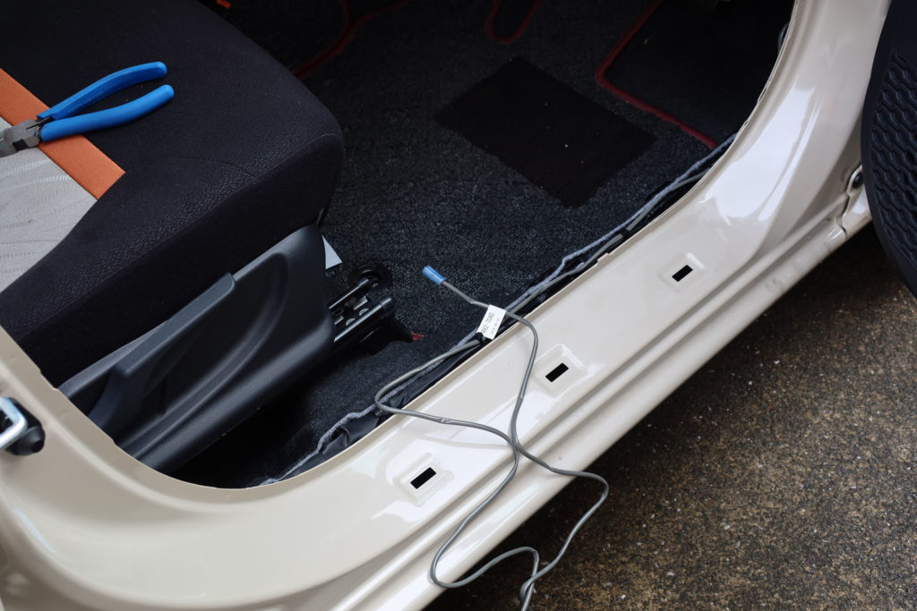 配線を助手席側のサイドシルに回していけばもっと工事が小規模で済む気もしますが、おそらく助手席側には配線が通っておらず、ランプのケーブルを固定する場所がないんでしょうね。悪あがきせずに説明書通りに内張を外してゆきます。