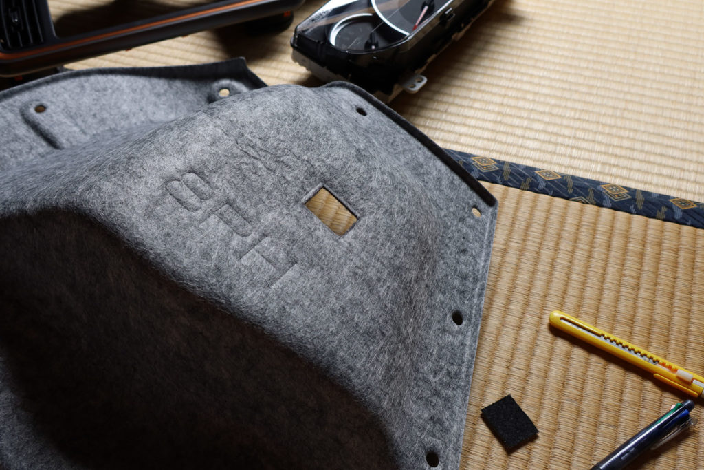 トランクルーム内張の加工。穴開け部には既にプレスラインが入っているので、それに沿ってカッターで穴開けをします。簡単に切れます。