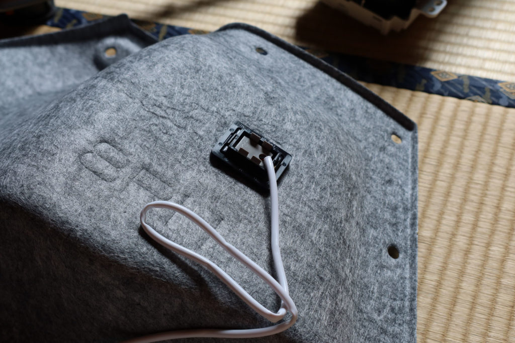 開けた穴にLEDモジュールを取り付けたところ。LEDモジュールの配線は30cmくらいのところでコネクタになっているので、こうしてクルマから離れた場所で作業できます。