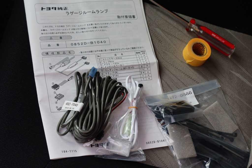 単に照明を付けるだけなら2,3千円でLEDが売られていますが、数年経って不点灯になるのも面倒なので、ディーラーが施工するのであれば5年保証が付くトヨタ純正パーツを入手して取り付けました。