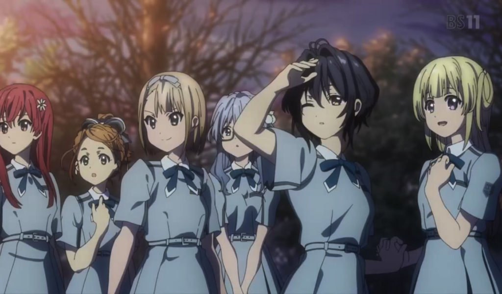 …と思ったら、京アニから独立した堀口悠紀子さん(「たまこまーけっと」等)のキャラクターデザインがベースになっていました。製作自体はA-1 Pictues(「あの花」「ソードアートオンライン」等多数)でした。キャラデザインで目を惹かれた感じですね。キャラごとにデザイン原案が異なり、真ん中の黄色い髪の子はデザイン原案などは深崎暮人氏(「冴えカノ」イラストレータ)らしいんですが、全体的に堀口悠紀子さん風味に統一されているような気がします。