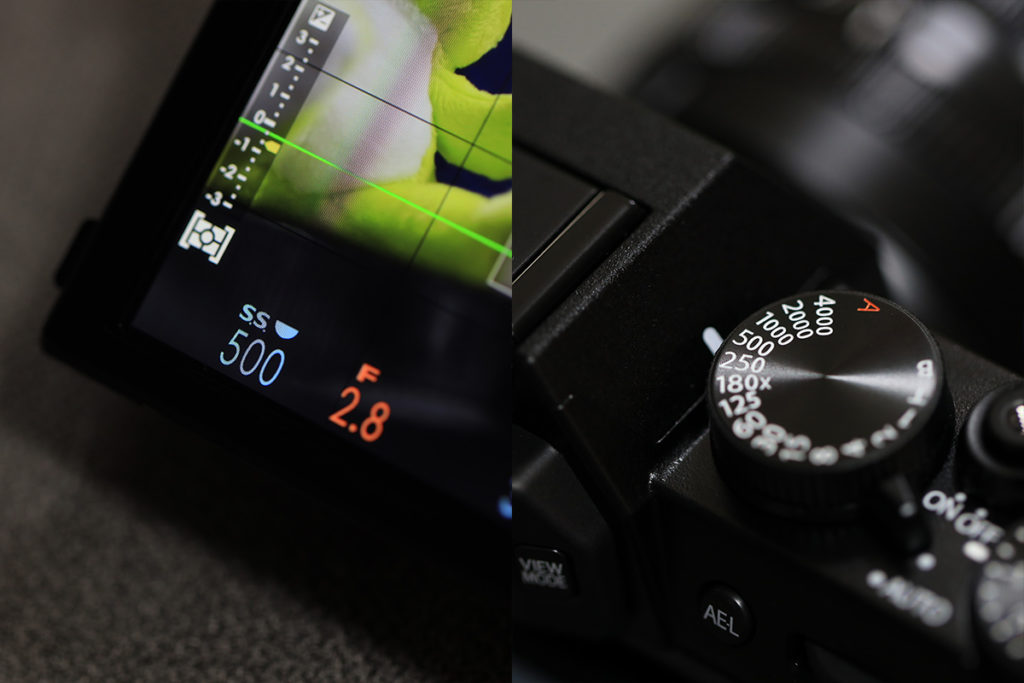 物理的なシャッター速度ダイヤルも謎ですね。ここでシャッター速度を合わせていても、親指のところのダイヤルで便利にシャッター速度を変更できてしまいます。すなわち、ボディ上部でけっこう大きな面積を取っているシャッター速度ダイヤルは、電源ON時の初期値を決めるダイヤルでしかないという訳です。いや、便利だと思いますが、上面の大きいダイヤルの存在意義は…?