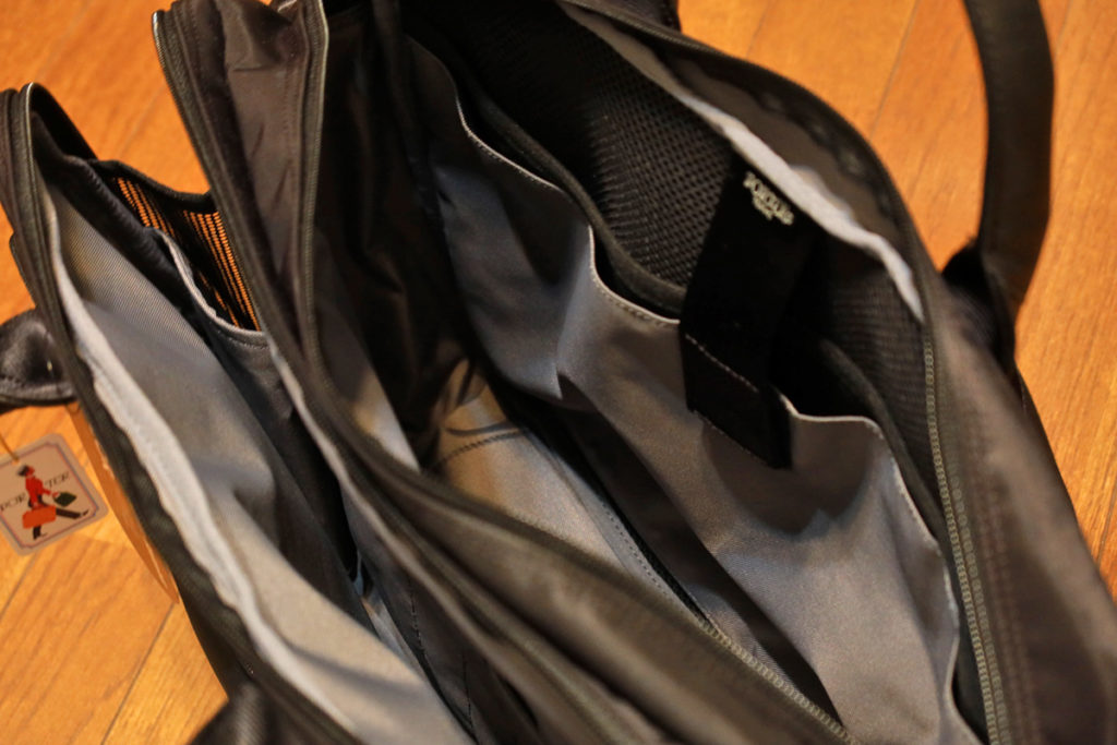 ちょっとウッカリしていたのが裏面で、「キャリーケースバー通し」があるのですが、単なるストラップで、以前のPORTER CLOUDのような「濡れた物入れ」(濡れた傘などの一時保持用)としては使えません。今度は濡れた傘はどうしよう。