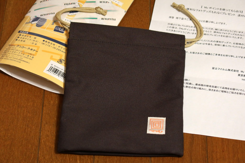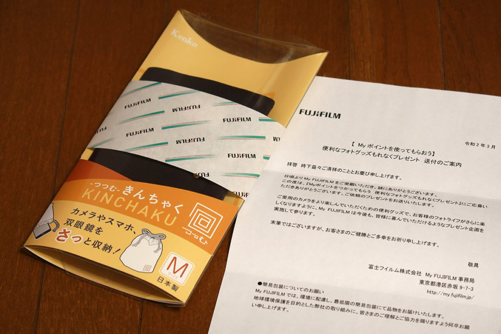 フジのX-T30を買ってユーザー登録したところ、ポイントが貯まりました。そのポイントを使って引き換えた景品が届きました。ケンコー・トキナーの「つつむきんちゃく」なんですが、案内状と一緒に入っていた景品にはご丁寧にも富士フイルムの包装紙が。
