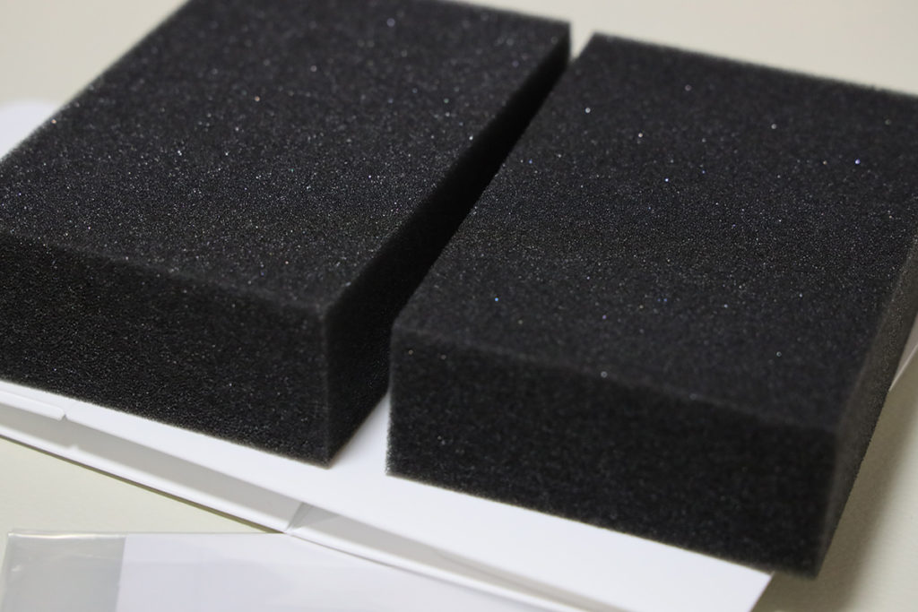スポンジを押し込みながらフタをすると説明書にありますので、そのようにします。フラップは意外なほどカッチリと閉まります。なお、これらの梱包材は再利用品である場合があるとのこと。