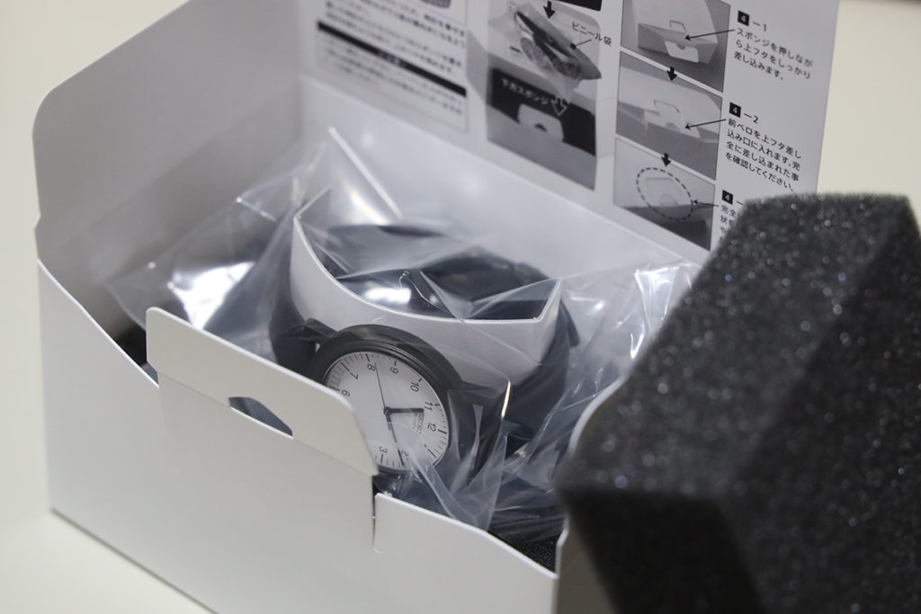 箱は意外にもプラ板製。時計の向きは写真の通りが指定されています。横からムギュっと圧縮することになるので少し気が引けますが…。