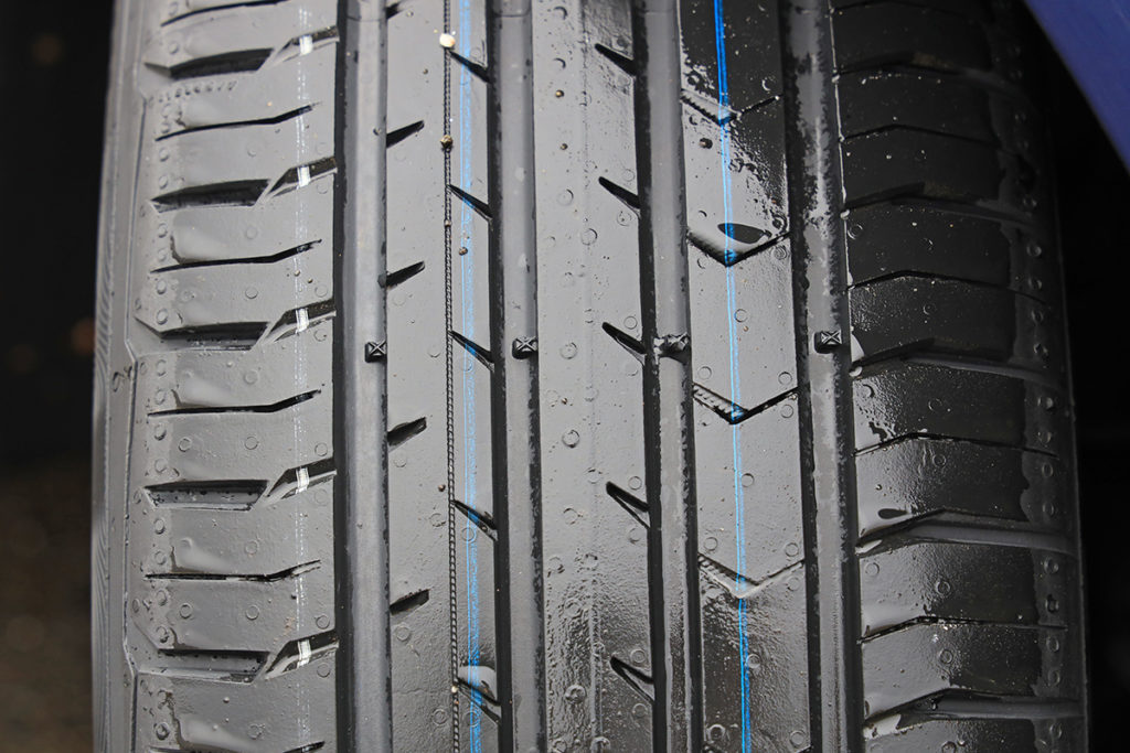 ちょっと小さめの[×]がついたスリップサインはコンチ独自のもので、残り3mmを示し、これを超えると雨天時の性能が悪化することを示すもの。