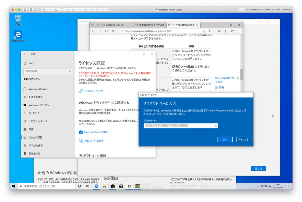 クリーンインストールにあたって、この仮想環境のWindowsはMicrosoftアカウントに紐付いて認証されているのでプロダクトキーの入力は不要かと思っていたのですが、そうでもなかったようで認証がかからず。そんなこと言ったってこのWindows 10は Windows 7 からの無償アップデート版なので、Windows 10のプロダクトキーなんてありません。さて…と少し考え、アップデート元の Windows 7のケースの裏に貼ってあったプロダクトキーを入れてみたら、通りました。