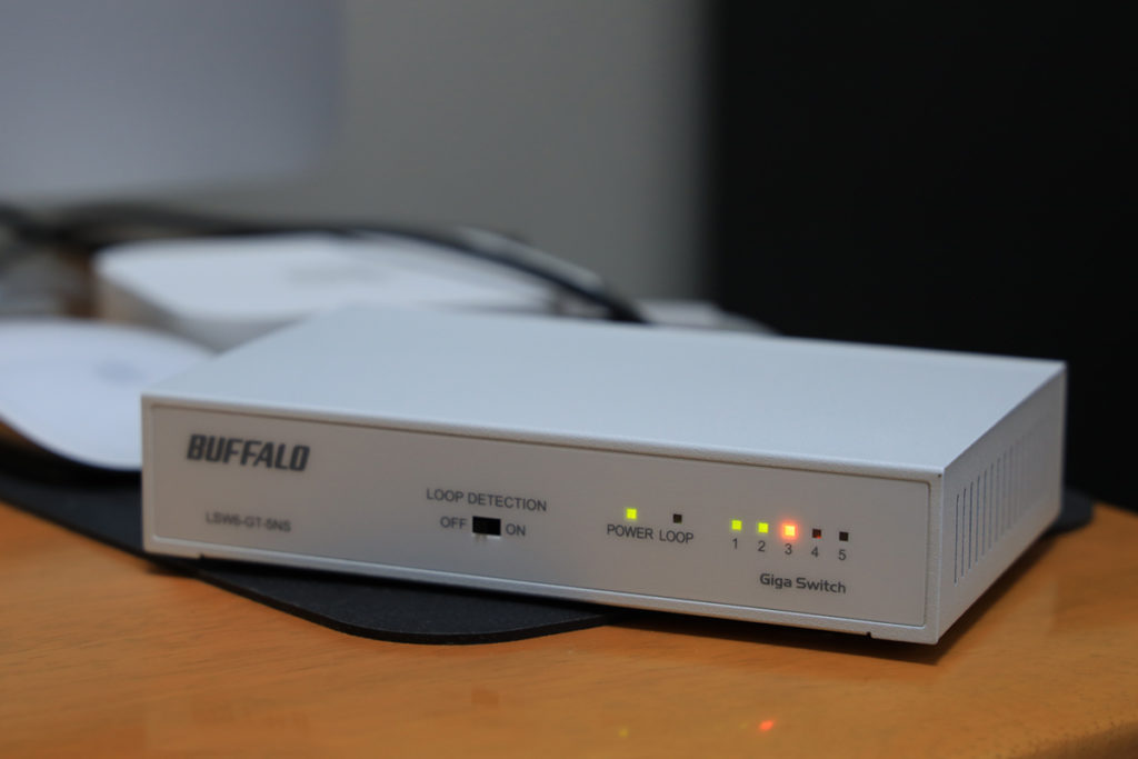 用意したのはBuffaloの「電源内蔵、金属筐体、ギガビット対応の、スイッチング」ハブ。型番で言うとLSW6-GT-5NS/WH です。2千円台中盤でした。私が買ったとき、色は黒が在庫なしでしたが、ホコリが目立たない白でよいです。NETGEARの同等性能のものも手持ちでありましたが、いかんせん10年選手なので耐久性が心配になり、新調しました。