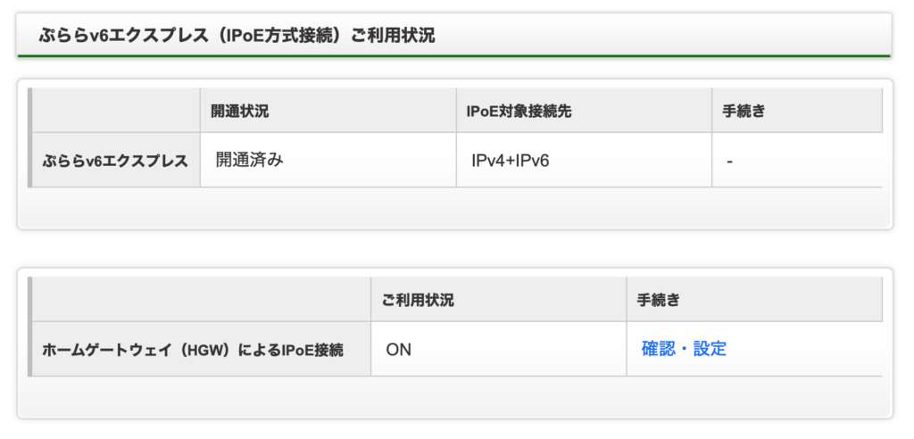 手続きはぷらら側の契約管理画面(マイページ)で「ホームゲートウェイ(HGW)によるIPoE接続」を「ON」にするだけなのですが、設定後すぐにはHGW(PR-400NE)を再起動しても反映されず、しかし一晩放置したらIPoEモードになっていました。確認方法ですが、「確認くん」というWebページに行って、「ゲートウエイの名前」(赤い文字)のところに「plala」が含まれていたらPPPoE(旧来の接続方法)、「OCN」が含まれていたらIPoE(新方式)で接続できているようです。
