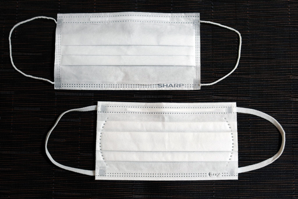 上は1回洗濯したシャープ製マスク。下は比較用のタマガワエーザイ製「フィッティ・シルキータッチモア」です。コロナ騒動前にコンビニやキオスクでよく見かけた、7枚入り(個別包装)398円くらいの物です。個別包装されていてもシャープ製と単価は同じくらいですね。どちらも立体三層構造です。