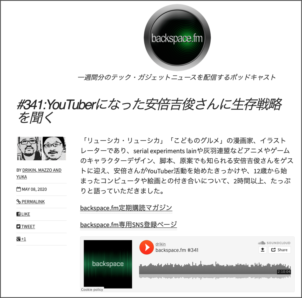 少し前のものになりますが、Backspace.fm の安倍吉俊さんの登場回を聴きました。安倍吉俊さんというのは「こどものグルメ」の作画担当であり、SIGMAの社長が目を通す優先度の高い重要書類の執筆者でもあります。聞き手は @drikin さんと @mazzo さんです。