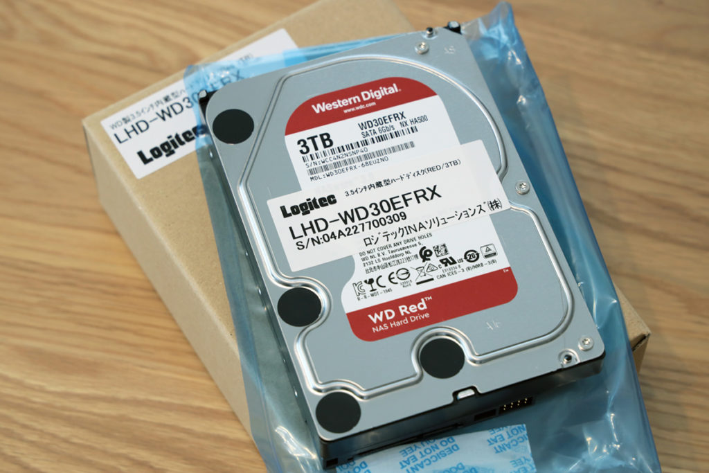交換したのはWD REDの3TB。商流がWDではなくLogitecのもので、保証期間が5年→3年になる代わりに、価格が2割安かったです。ロジテックINAソリューションズのINAって伊那市のことですよね…?