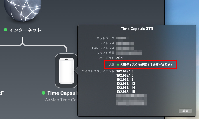 2017年2月に導入し、その後2017年10月に交換となったTime Capsule 3TBのHDDがお亡くなりになりました。2年8ヶ月ですかね、寿命短いなぁ。「内蔵ディスクを修復する必要があります」と言われても実際は修復が効かないのは他の方の事例と同様です。