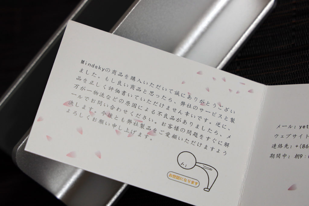 最近大陸から直送される製品に、丁寧な挨拶カードが同梱されることが多くなりましたね。マイソドスカイとかお約束の誤字も昔なら笑いのネタにしていましたが、最近は中国人の誠実さが伝わる感じがしてそんな気も起きなくなりました。中国人が真面目になって礼を尽くすようになったら日本人の存在意義がヤバいですね。
