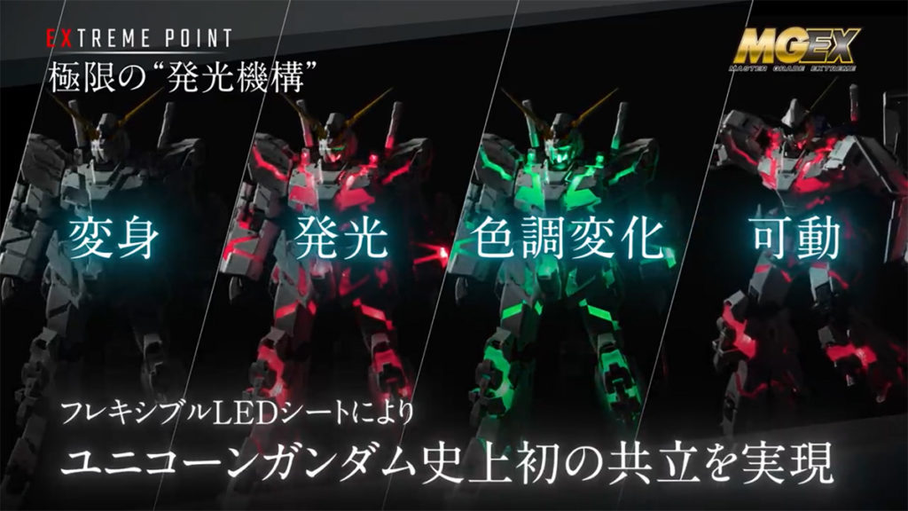 光って可動する1/100ユニコーンガンダムが出るそうです。シリーズはMGEX(MGエクストリーム)という、あまり奇をてらった感じではないネーミングのMG上位グレードになるようです。