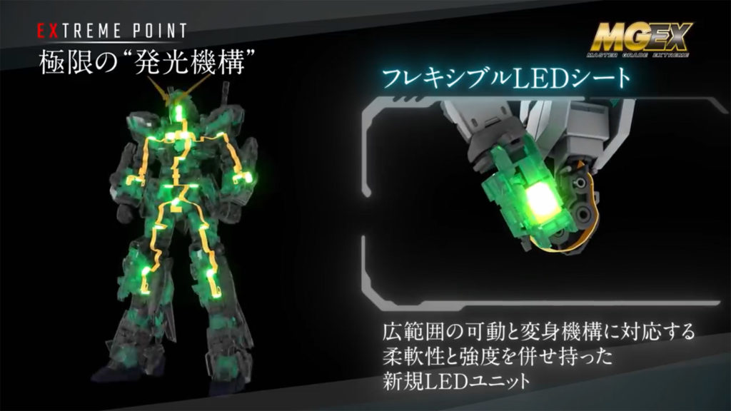 1/144 RGは光るけど可動せず、1/60 PGは光るけど可動はそこそこでしたので、どれくらいの完成度になるのか楽しみではあります。「LEDフレキシブルシート」を使用するとのことなので、おそらく1/144 RGの発光システムに近いものを使うような気がします。1/144の発光システムはフレキケーブルの上に直接LEDチップが半田付けされているもので、導光パーツの巧みさもあって少ないLEDチップで全身を点灯させるという技を見せつけました。これが今回可動するようになるというイメージでしょうか。