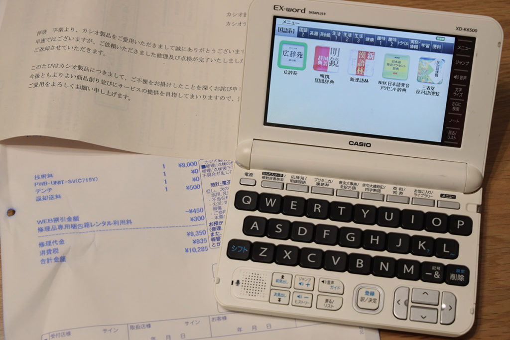なんかいろいろ故障してばかりですが、今度は私が海外出張用に買ったものの、いざ現地に行ったらあまり使わずムスメに奪われてしまった電子辞書CASIO XD-K6500 が故障。購入後3年足らず、ちょっと故障早くないですかカシオさん。症状は起動時にメモリにアクセスできないというもので、素人が手出しできる系の故障ではありません。まだ3年しか使っていないので新しいの買うのもちょっと癪(しゃく)だし、新しいのが2万円、修理だと1万円。