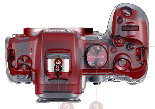 画像合成ミスなのか分かりませんが、R6は光軸に対して少しアクセサリシューがオフセットされているようにも見えます。あれ、そういえば背面ダイヤルが付いたと言うことは、モードダイヤル右のダイヤルは何に使うんでしょうか…?