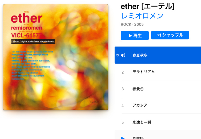さて、レミオロメンと言えば、Official髭男dismの中の人が「初めて買ったCDはレミオロメンのether」とラジオで発言していたのを聞いて腰抜けました。eher、自分も買ったのですが前回の引越のとき以来どこに行ったか不明で、でもiTunesには取り込んである状態。ディスクはどこに行ったんだろう…。