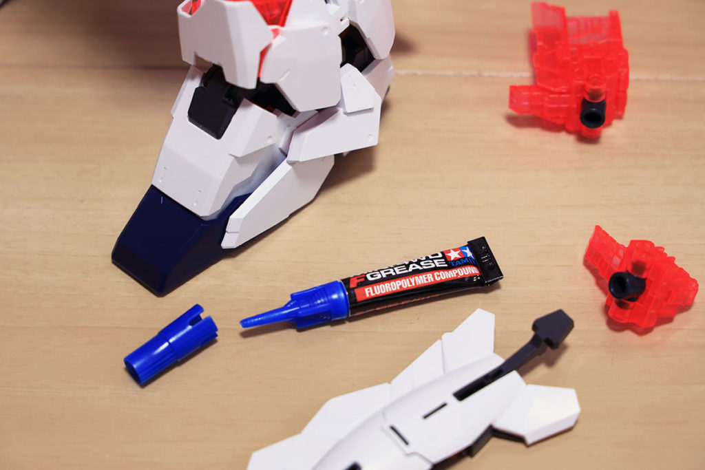 PGユニコーンは変身時のギミックが凝っていて、いくつかの箇所が連動して動くことが多いです。それがスムースに動けば良いのですが、なかなかそうもいかず。これどうやって動かすの…と路頭に迷うくらい固いところも1箇所や2箇所ではなく、そういうところをグリスアップしようというわけです。