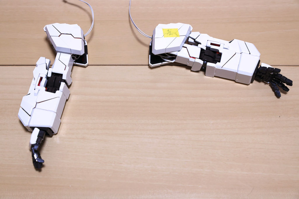 割合と腕自体はサクサク完成したのですが、難儀なのは例によって電飾の配線。組み立て説明書には可動に必要な配線のたるみをどこにどのくらい確保しておくかという記載が一切なく、完成後にどのように動くのかが頭に入っていないと何度も配線をやり直す羽目になります。私のように。