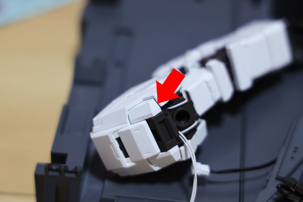 あとどうしても肩の上部アーマーがうまくNT-Dできなくて、なぜだと調べた結果、矢印の箇所の微妙な干渉(クリアランス不足)が原因でした。少しカットして解決。写真はクリアランスを確保した後。この矢印の先にある小さな装甲、肩の上部アーマーが持ち上がると連動してこの小さなアーマーが下に引っ込むんですよ…そういう連動ギミックが組み立ての難易度を上げている一つの原因だと思います。オモチャじゃないんだから、連想ギミックなんてそんなにいらないんだけど…。